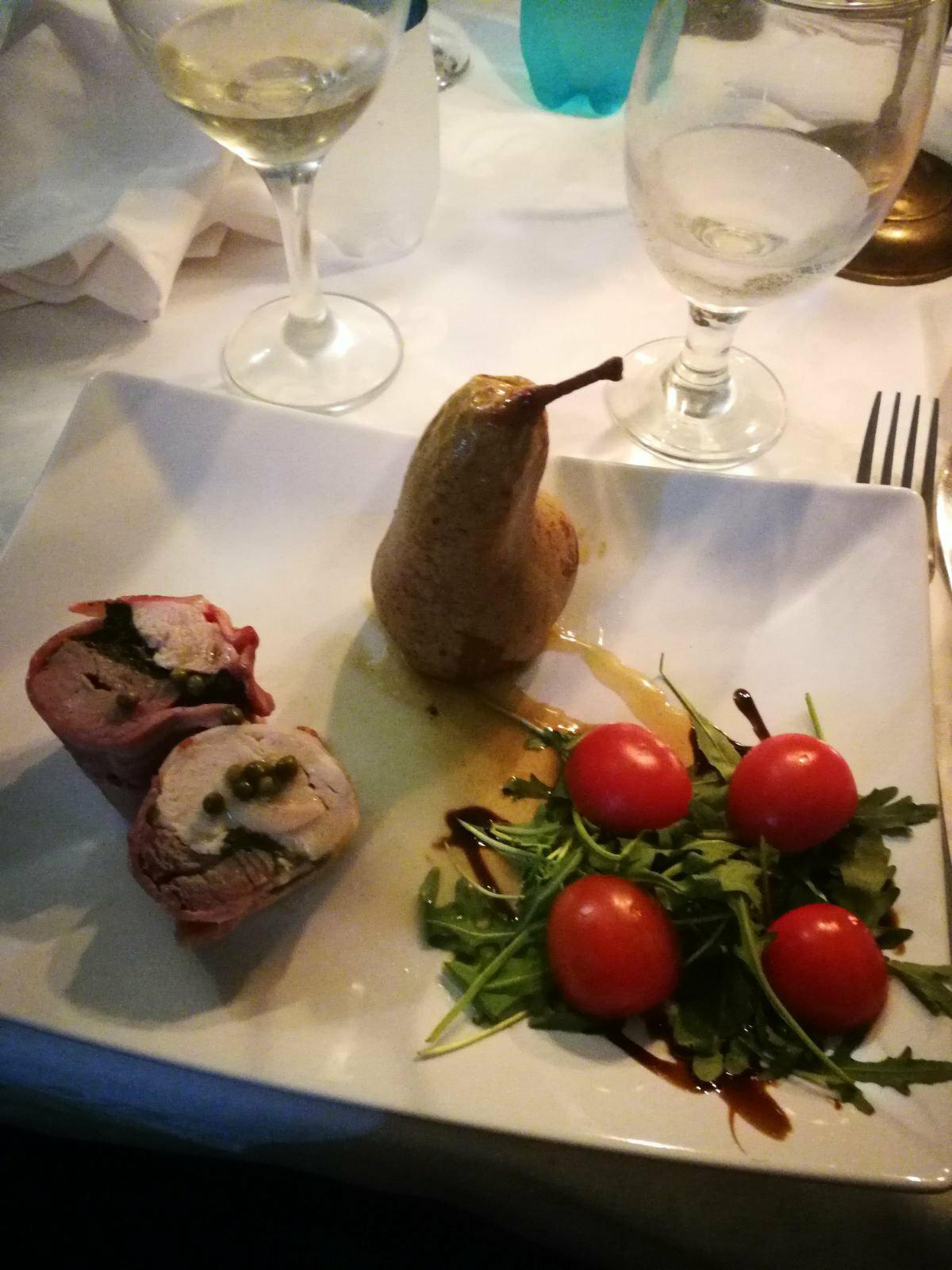 “Duo de vită cu spanac și piept de curcan în sos de piper verde cu pară caramelizată și rucola cu oțet balsamic” sună a “m-am străduit”.